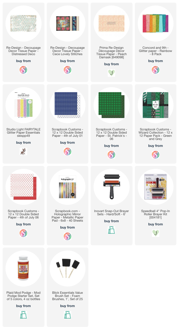 Supplies: a composition notebook, Mod Podge or other decoupage medium. a brayer, paint brushes-foam or paint brushes, acrylic paint, scrapbook paper, glitter paper, gesso, tissue paper, ruler and scissors, letter stickers, other embellishment
